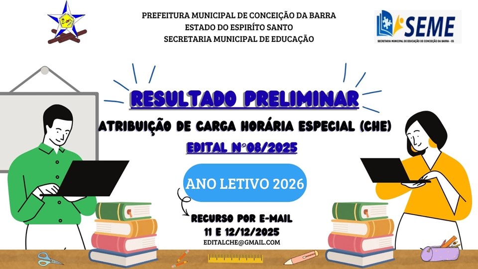 A Secretaria Municipal de Educação de Conceição da Barra publica o Resultado preliminar da Carga Horária Especial (CHE) para ano letivo de 2026 conforme Edital nº 08/2025