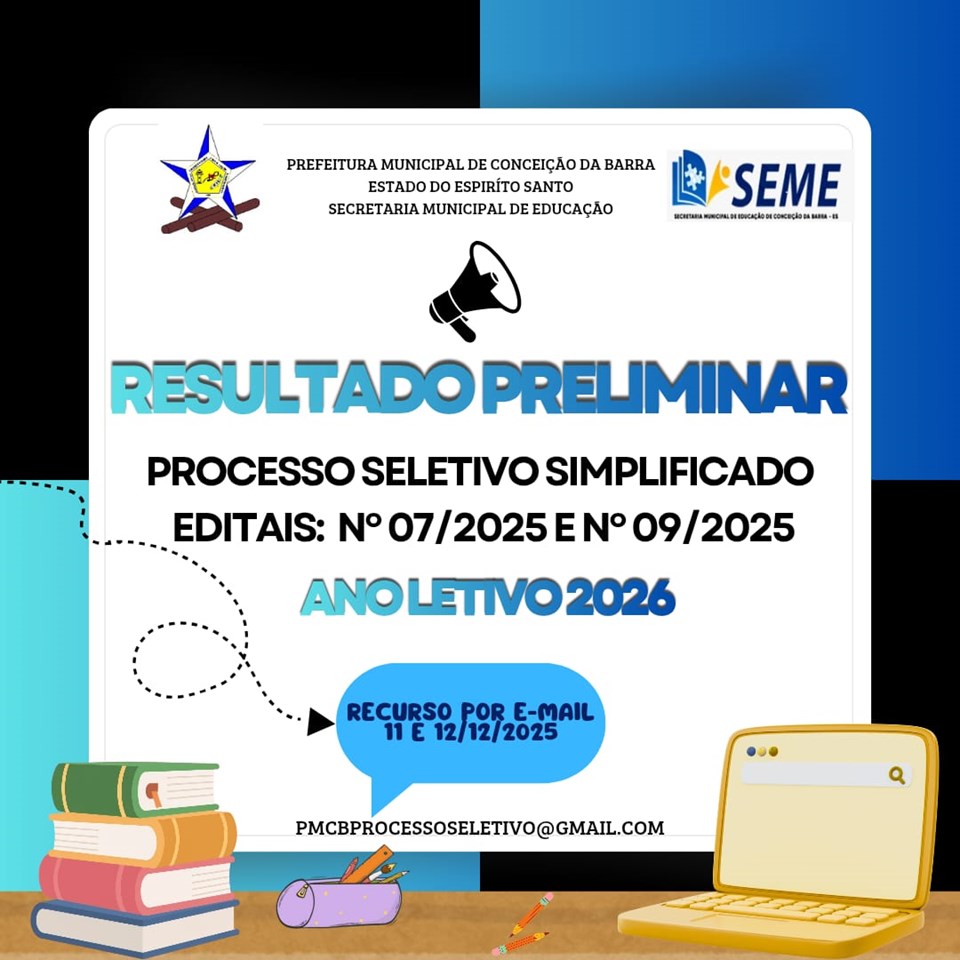A Secretaria Municipal de Educação torna pública a divulgação do resultado preliminar do Processo Seletivo Simplificado dos Editais: Nº. 07/2025 e 09/2025 para o ano letivo de 2026.