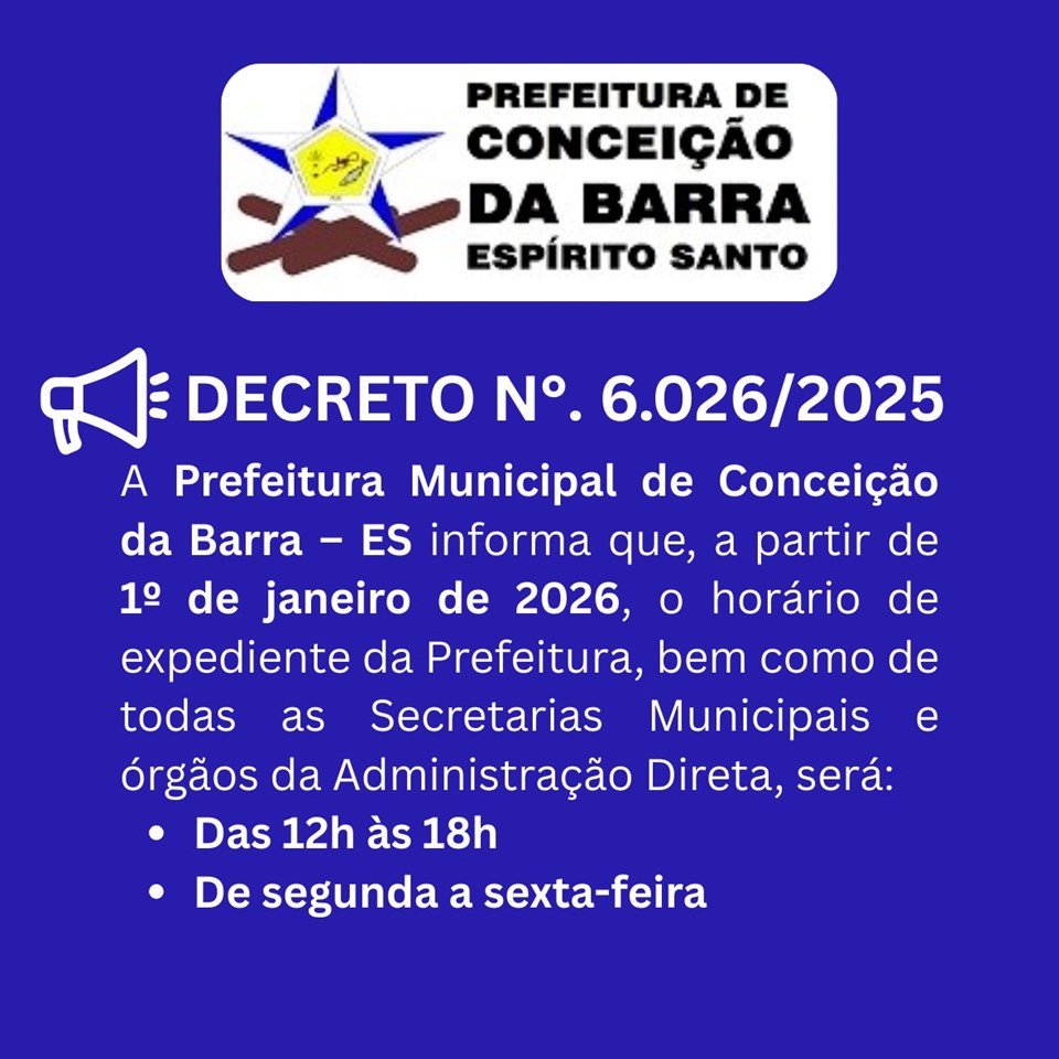 Fica estabelecido que a partir de 01 de janeiro de 2026, o horário de expediente da Prefeitura Municipal de Conceição da Barra-ES, bem como de suas secretarias e órgãos da administração direta, será das 12h (doze horas) às 18h (dezoito horas), de segunda-feira a sexta-feira.