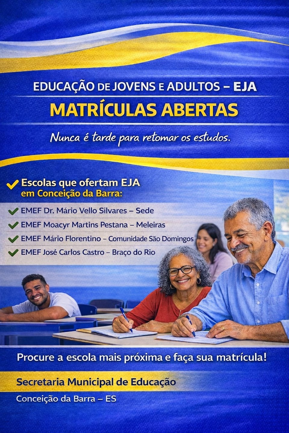 A escola está de portas abertas para jovens, adultos e idosos que acreditam que aprender transforma, fortalece e abre novos horizontes. Cada matrícula representa uma nova história, um novo passo e a certeza de que o conhecimento pode chegar em qualquer fase da vida.