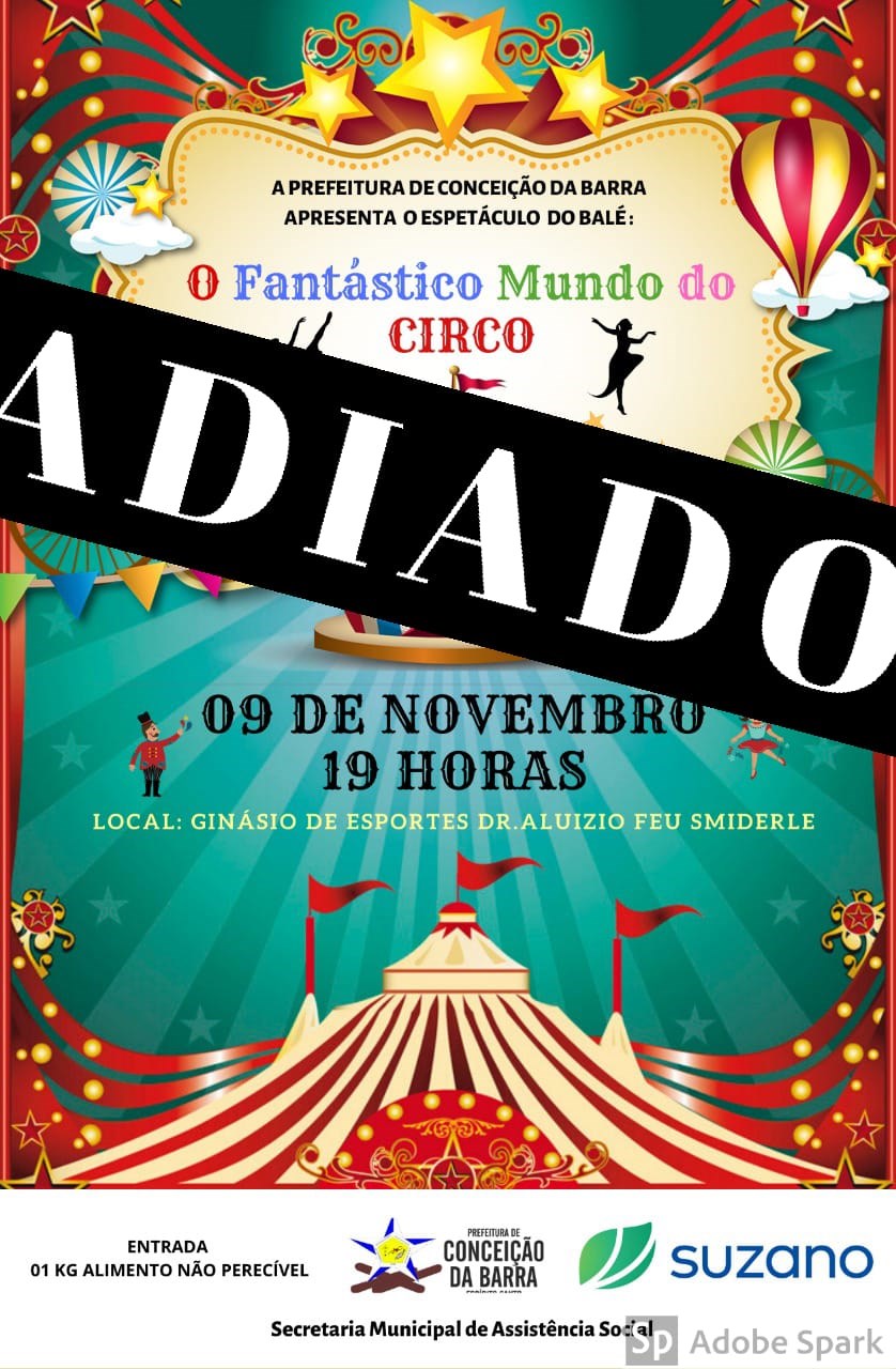 Em função do ocorrido fica ADIADO o ESPETÁCULO “O FANTÁSTICO MUNDO DO CIRCO”, que seria promovido pela Secretaria de Assistência Social em parceria com empresa Suzano.