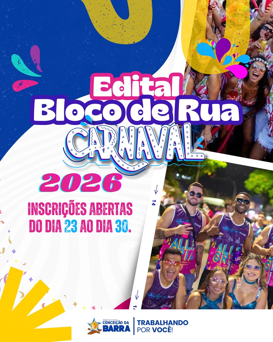 A Prefeitura Municipal de Conceição da Barra, por meio da Secretaria Municipal de Turismo (SECTUR), torna público o Edital de Chamamento Público nº 001/2026, destinado à seleção de até 10 (dez) Blocos de Rua, para celebração de Termo de Colaboração sem repasse financeiro, visando a realização dos desfiles do Carnaval 2026 no Município de Conceição da Barra e na Vila de Itaúnas, no período de 14 a 17 de fevereiro de 2026.