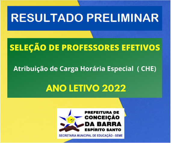 A Secretaria Municipal de Educação (SEME) divulga nesta terça-feira, dia 11 de Janeiro de 2022, o resultado preliminar do Edital nº 02/2021 , que estabeleceu os critérios para a atribuição de Carga Horária Especial (CHE) aos professores efetivos que desejam atuar na regência de classe no ano letivo de 2022.