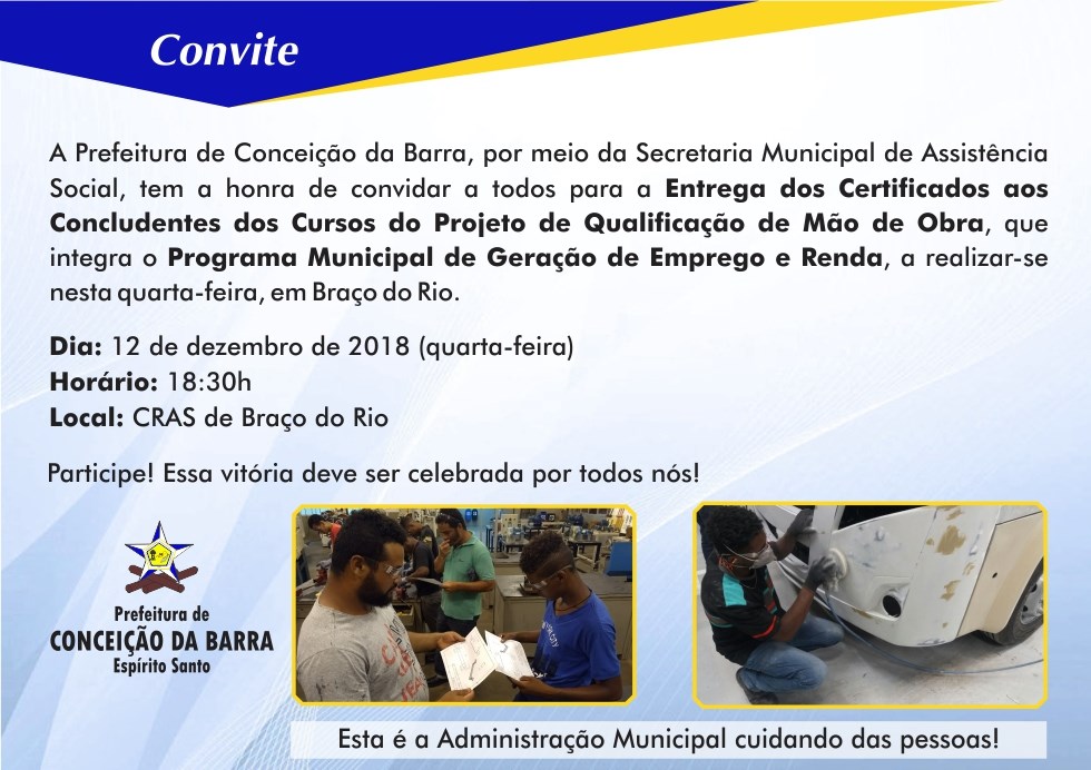 Nesta semana, a Administração Municipal oficializará a concretização de importantes ações na Sede e em Braço do Rio. Na segunda-feira (10/12) e na quarta-feira (12/12) serão realizadas as cerimônias de entrega dos Certificados de Qualificação de Mão de Obra aos alunos que passaram pelos cursos gratuitos oferecidos pela Prefeitura, através do Programa de Geração de Emprego e Renda, coordenado pela Secretaria de Assistência Social.