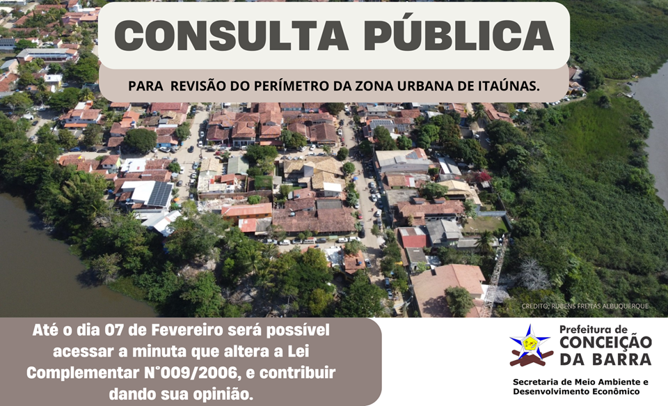 A Prefeitura de Conceição da Barra abriu o prazo para consulta pública que promoverá a análise do Projeto de Lei Complementar que altera dispositivo da Lei Complementar nº 009/2006, para revisão do perímetro da Zona Urbana do Distrito de Itaúnas, no Município de Conceição da Barra. Até o dia 07 de fevereiro será possível acessar a minuta e contribuir com eventuais mudanças no documento disponível no final desta matéria.