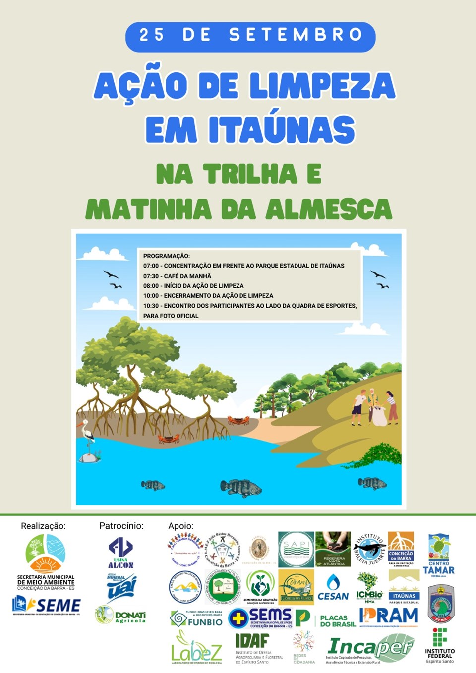 A Administração Municipal, através da Secretaria de Desenvolvimento Econômico, Saneamento, Habitação e Meio Ambiente e da Secretaria Municipal de Educação, em parceria com outras Secretarias Municipais e instituições que atuam com Educação Ambiental no Município promoverão uma Ação de Limpeza na Trilha da Almesca ou Matinha como, também, é conhecida em Itaúnas. A Ação acontecerá no dia 25 de setembro, conforme programação a seguir: