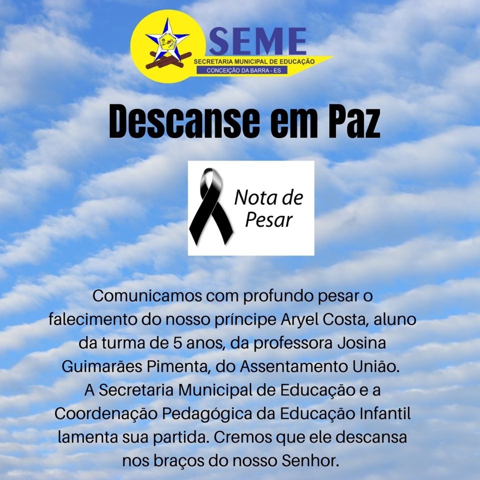 Comunicamos com profundo pesar o falecimento do nosso príncipe Aryel Costa, aluno da turma de 5 anos, da professora Josina Guimarães Pimenta, do Assentamento União.