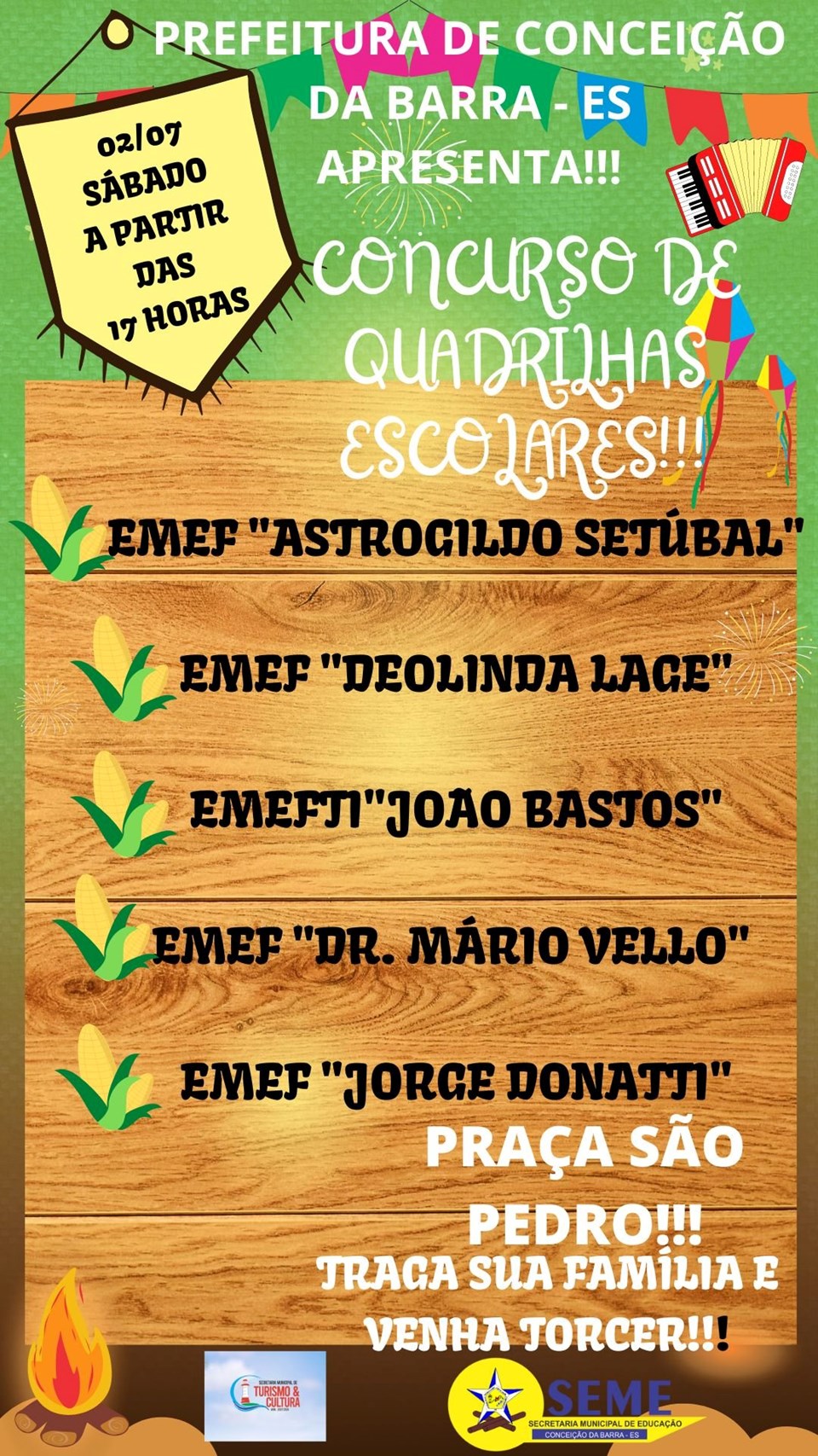 PREFEITURA DE CONCEIÇÃO DA BARRA ATRAVÉS DA SECRETARIA MUNICIPAL DE TURISMO E CULTURA E SECRETARIA MUNICIPAL DE EDUCAÇÃO CONVIDA A TODOS PARA O CONCURSO DE QUADRILHAS ESCOLARES!