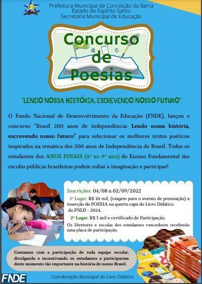 SECRETARIA DE EDUCAÇÃO, ATRAVÉS DO FNDE, LANÇA CONCURSO DE POESIAS: "LENDO NOSSA HISTÓRIA, ESCREVENDO NOSSO FUTURO" destinado a estudantes dos ANOS FINAIS (6º ao 9º ano) do Ensino Fundamental das escolas públicas.