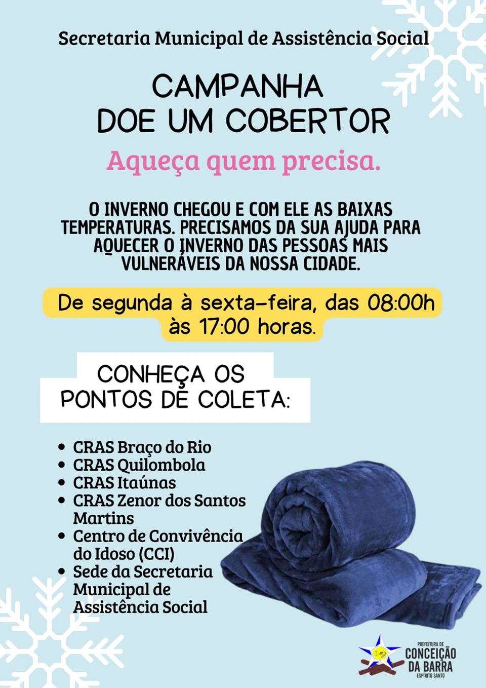 Com chegada do inverno, a Prefeitura de Conceição da Barra, por meio da Secretaria Municipal de Assistência Social, está promovendo Campanha Doe um Cobertor, que objetiva arrecadar cobertores novos e seminovos higienizados para a população em situação de vulnerabilidade social.